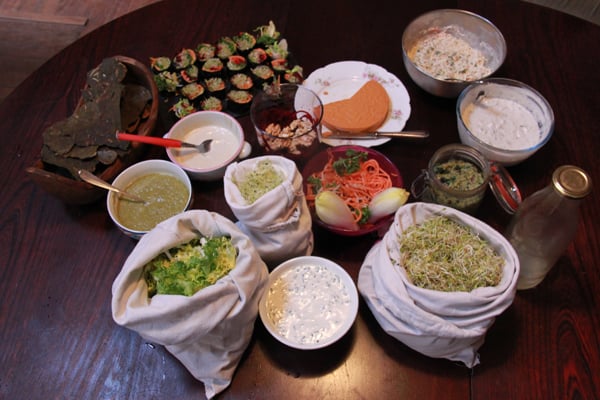 Composition: Légumes de notre jardin suivant les saisons*(courgette, pâtisson, concombre, chou rave, chayottes, tetragone, carottes, ail des ours, chou Kale, courge Butternut...), graines germées revitalisées (tournesol, amandes), curcuma*, ail*, sel*